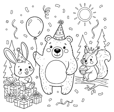 A fluffy llama wearing a colorful party hat and draped with strings of pom-poms and balloons. The llama is surrounded by wrapped gift boxes and a large cupcake with a single candle.