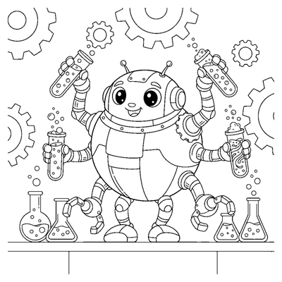 A friendly, round robot sits on a red planet's surface eating a sandwich made of gears and bolts. In the background, there is a small space rover and distant rocky mountains under two moons.