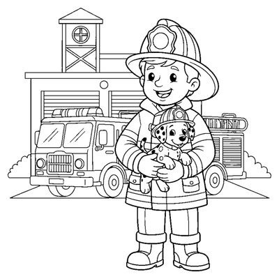 Two children wearing oversized firefighter helmets and boots practicing with a garden hose in their backyard. A friendly dalmatian puppy sits nearby with a toy fire truck.